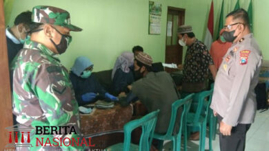 Babinsa Sumberrejo saat membantu pengamanan vaksinasi yang berlangsung di gedung MWC NU (Heru/BeritaNasional.ID) Babinsa Desa Sumberejo Bantu Amankan Pelaksanaan Vaksinasi Covid-19