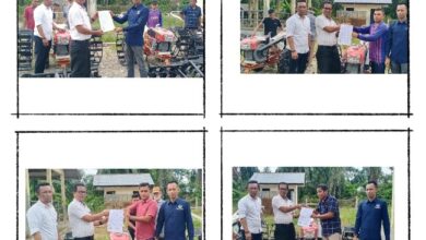 Ketua Dewan Pimpinan Daerah (DPD) Partai Nasional Demokrat (NasDem) Kabupaten Aceh Tamiang, Mualizar Zikri serahkan bantuan Hand Traktor Quick Zeva G 3000 kepada tiga kelompok tani di Halaman Pasar Hewan Tualang Cut, Rabu (13/7/2022). (ERWAN|BERITANASIONAL.ID) Ketua DPD NasDem Aceh Tamiang Serahkan Bantuan Hand Traktor