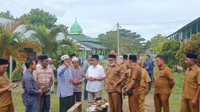 Penjabat Bupati Aceh Utara Azwardi, AP, MSi, melihat langsung kondisi Dayah Madinatuddiniyah Babul Huda usai terbakar Gampong Paloh Lada, Kecamatan Dewantara, Senin 22 Agustus 2022. (Foto : Dok Humas Pemkab Aceh) Pj Bupati Aceh Utara Kunjungi Dayah Terbakar di Glee Madat