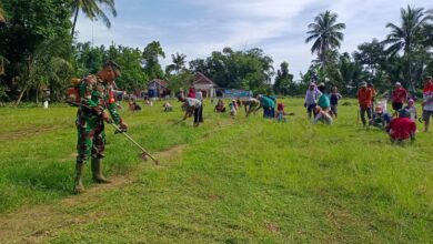 Lapangan tempat upacara pembukaan TMMD dibersihkan (Zainul Muhaimin/Berita Nasional.ID) Prajurit TNI Bondowoso Bersih-bersih Lapangan Tempat Pembukaan TMMD