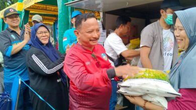 Tampak Bupati Situbondo kaos merah melayani masyarakat saat membeli beras pada operasi pasar (Heru Hartanto/BeritaNasional.id) Pemkab Situbondo dan Perum Bulog Gelar Operasi Pasar di Area Car Free Day