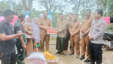 Camat Indra Makmu, Muhammad Arif serah bantuan masa panik untuk pimpinan balai pengajian. Camat Indra Makmu Kunjungi Balai TPA Yang Amblas ke Sungai