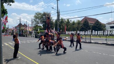 Salah Satu Peserra pawai karnaval saat tunjukan atraksi di start (foto:Rochim/BeritaNasional.ID) Lomba Pawai Karnaval Jenjang SD/MI di Kabupaten Lumajang Dalam Rangka HUT RI Ke 78 Berikut Pemenangnya