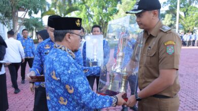 Sekdakab Asahan Drs. John Hardi Nasution menyerahkan trophy kelurahan terbaik tingkat Kabupaten Asahan Tahun 2023.(dok:Ist) Dalam Upacara HKN, Sekdakab Asahan Serahkan Penghargaan Kelurahan dan Desa Terbaik