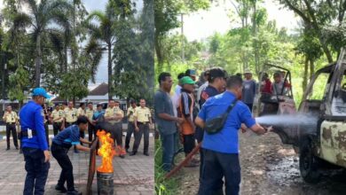 Kiri, simulasi di BRI, kanan, memadamkan api yang membakar mobil pick up (Syamsul Arifin/BeritaNasional.ID) Dalam Sehari, Damkar Berurusan Dengan Api Di Dua Titik