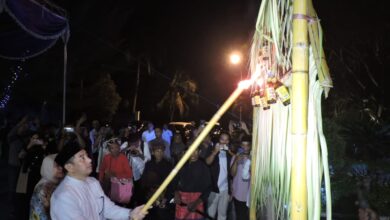Bupati Bone Bolango Hamim Pou didampingi Ketua Tim Penggerak PKK Kabupaten Bone Bolango Loly Pou Junus saat memasang lampu (Tumbilotohe) di Rudis (Bandhayo) Bupati Bone Bolango (foto:JP) Hamim Pou: Tradisi Tumbilotohe Tak Boleh Abaikan Syariat