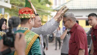 Kakanwil Gorontalo menyambut Irjen Kemenkumham RI dan memakaikan kopiah khas Gorontalo (foto: Humas) Irjen Razilu Pantau Ruang Layanan Publik di Kemenkumham Gorontalo