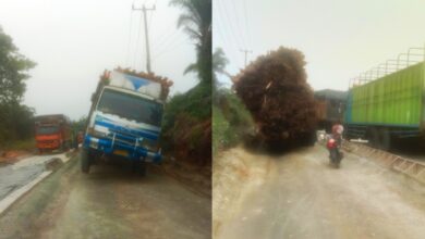 Foto kondisi Mobil Truck Subkontraktor mitra PT.Arara Abadi Perawang yang hampir Tumbang di Jalan Hang Lekir yang menyebabkan antrian panjang tersebut.(Dok.Bernas.Network) Diduga PT.Arara Abadi Perawang Lalai, Akibatkan Antrian Panjang Berkilo-kilo Meter Selama 14 Jam