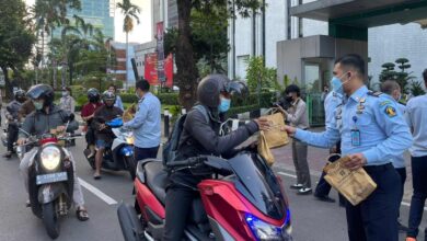 Para pegawai Kemenkumham membagikan Takjil bagi masyarakat pengguna jalan, di sekitar perkantoran Kemenkumham. (Foto: Humas Kemenkumham-BeritaNasional.ID) Takjil dari Warga Binaan Pemasyarakatan Dibagikan ke Masyarakat