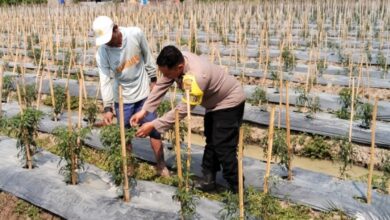 Babinkamtibnas Polres Pringsewu saat mengajarkan petani merawat cabai. (Ist) Ketahanan Pangan, Bhabinkamtibmas Polres Pringsewu Bantu Petani Cabai