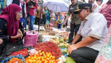 Pj Gubernur Sulbar Bahtiar Baharuddin saat memantau harga sembako di pasar Polewali .(foto frd/yuni) Pj Bahtiar Pastikan Harga Kebutuhan Pokok Terkendali Di Pasar Baru Polman