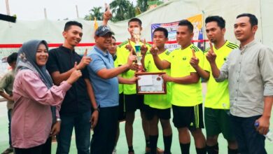 Foto Ketua RT.07/RW.01 Kelurahan Perawang, Nila Dewi saat penyerahan Piala pemenang Turnamen Sepak Takraw Port Pipa Cup 1 Sekabupaten Siak.(Dok.Bernas.Network) Sukses Gelar Turnamen Sepak Takraw Se-Kabupaten Siak, Warga Beri Apresiasi Ketua RT.07/RW.01 Kelurahan Perawang