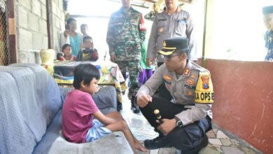 Kapolres Situbondo AKBP Dwi Sumrahadi Rakhmanto, S.H., S.I.K., M.H. didampingi Kapolsek Panarukan AKP Effendy Nawawi, SH, ketika mengunjungi rumah Maulana penderita lumpuh (Heru Hartanto / BeritaNasional.ID) Peringati HUT Bhayangkara ke -77, Kapolres Situbondo Salurkan Santunan Kepada Anak Lumpuh