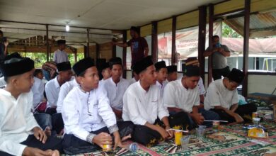 Grub zikir atau Aneuk Dike sedang bersalawat kepada Nabi Muhammad SAW di Balai Nenasah Desa Alue Bu Tuha. (Foto: Romi Syahputra/Bernas). Rayakan Maulid, Ratusan Warga Alue Bu Tuha Bawa Nasi ke Menasah