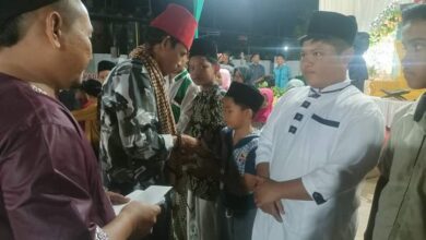 Waled Meuraksa Pidie Jaya serah santunan anak yatim di halaman Mesjid Baitul Hidayah Alue Ie Mirah. (Foto: Romi Syahputra/Bernas) Peringati Maulid, Remaja Mesjid Baitul Hidayah Bahagiakan Anak Yatim