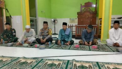 Petugas Polres Sekadau mmberikan pengamanan giat Safari Subuh di masjid Jami Baiturahmah. (Foto: Aji) Polisi Lakukan Pengamanan Safari Subuh KNRP Kalbar di Sekadau