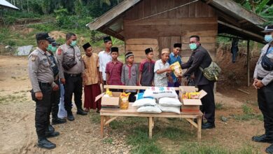 Koordinator Security PT Medco E&P Malaka Azwir bersama tim menyerahkan paket sembako kepada anak yatim/piatu. (Foto: Security Medco) Security Medco Kembali Berbagi Dengan Yatim Piatu