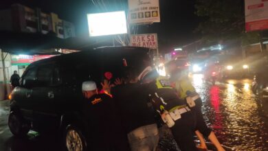 Satlantas Polres Pringsewu Evaluasi Kendaraan Mogok. (SGY/BeritaNasional.ID) Sejumlah Ruas Jalan di Pringsewu Tergenang Air, Polantas Berjaga dan Atur Lalulintas