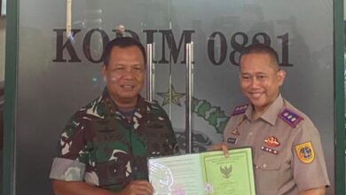 HM Rocky Soenoko S.H., M.Si kepala BPN Lumajang saat serahkan Sertifikat Ke Pangdam V Brawijaya mayjen Farid Makruf, MA (foto: Rochim/BeritaNasional.ID) BPN Lumajang Serahkan Sertifikat Hak Pakai Tanah Aset TNI AD Ke Pangdam V Brawijaya