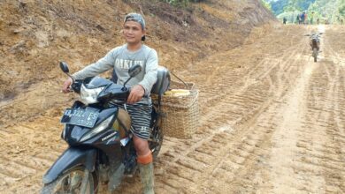 Salah seorang warga Desa Bahenap Yohanes Ungu mengendarai sepeda motor untuk berangkat mengambil dagangannya,dok foto istimewa Jalan Desa Bahenap Lancar, Oleh Sentuhan Tangan Para Satgas TMMD