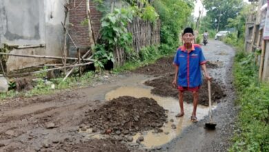 Warga sekitar Rais melakukan pembetulan jalan di depan rumahnya.(Yuliono/BeritaNasional.ID) Jalan Ronggojalu Rusak Parah, Warga Berinisiatif Lakukan Perbaikan Sendiri