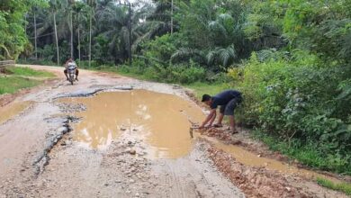 Seorang warga membuat aliran air di jalan Alue Ie Mirah - Julok. (Foto: FB MFaisal) Bantu Pemerintah, Warga Alirkan Air Tergenang di Badan Jalan Alue Ie Mirah – Julok