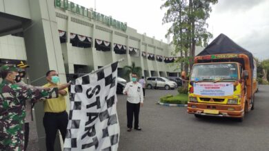 Baju kuning Wabup Yoyok bersama Kapolres dan Dandim saat melepas truk bermuatan bantuan sosial pakan ternak (Heru Hartanto) Wabup Yoyok Lepas Truk Bermuatan Pakan Ternak Silase Batang Sorghum