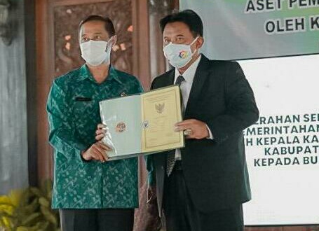 BeritaNasiona.ID NGANJUK – Plt Bupati Nganjuk, Marhaen Djumadi menerima sertifikat hak pakai aset Pemkab Nganjuk dari Badan Pertanahan Nasional (BPN) Kabupaten Nganjuk, Jumat (21/05/2021). Surat tanda bukti legalitas aset milik negara tersebut diserahkan oleh Kepala BPN Kabupaten Nganjuk, Masduki, SH, MH di Pendopo Kabupaten Nganjuk.