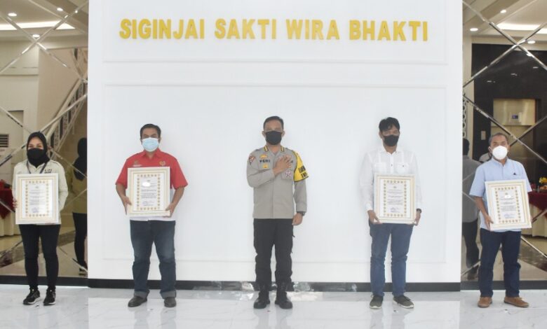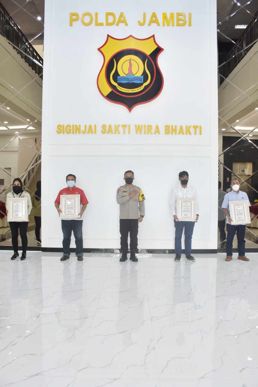 Penyerahan penghargaan berlangsung di lobby Gedung Utama Polda Jambi, Rabu (7/7/2021), dilakukan oleh Kapolda Jambi Irjen Pol Albertus Rachmad Wibowo, Wakapolda Brigjen Pol Yudawan R, Irwasda Kombes Pol Dwi Gunawan, dan Karo Ops Kombes Pol Feri Handoko.