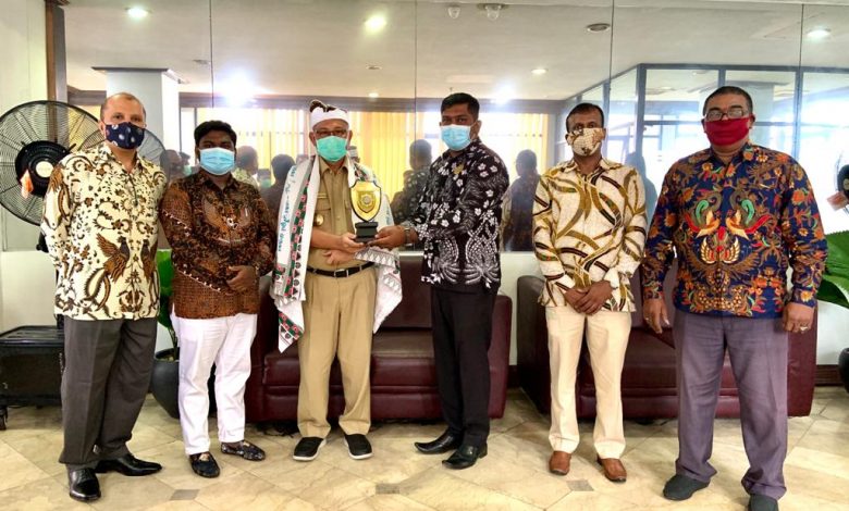 BeritaNasional.ID Medan – Dengan penuh keakraban dan kekeluargaan, Pelaksana tugas (Plt) Wali Kota Medan Ir H Akhyar Nasution MSi menerima kedatangan Pengurus Parisada Hindu Dharma Indonesia (PHDI) Kota Medan di Balai Kota Medan, Senin (31/8/2020). Selain bersilaturahmi, tujuan kehadiran PHDI untuk memakaikan Udeng (ikat kepala khas masyarakat Hindu Pulau Dewata) serta Ponade (kain sari khas India) sebagai ungkapan syukur atas kesembuhan Akhyar pasca terkonfirmasi terpapar Corona Virus Disease 2019 (Covid-19) beberapa waktu lalu.