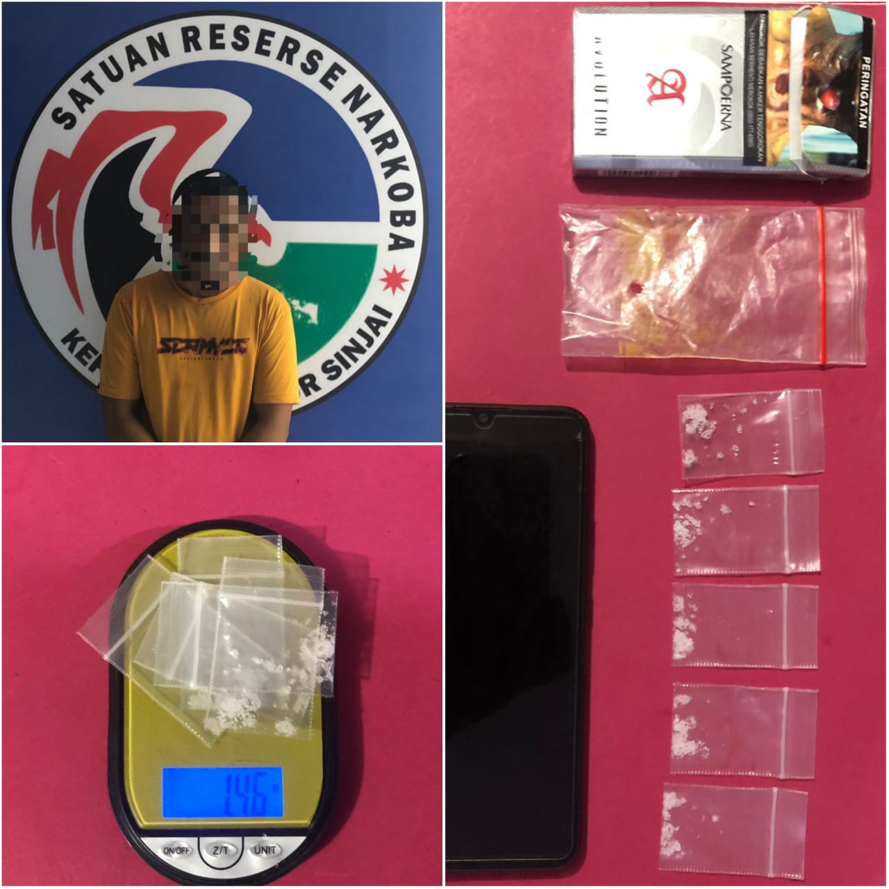 Dalam penangkapan tersebut juga mengamankan barang buktinya berupa 5 (lima) buah plastik bening ukuran sedang diduga berisi shabu dengan berat 1,46 gram, 1 (satu) unit Handphone merk Realme warna hitam, 1 (satu) buah plastik bening ukuran sedang, dan 1 (satu) buah pembungkus rokok merk Sampoerna Evolution.