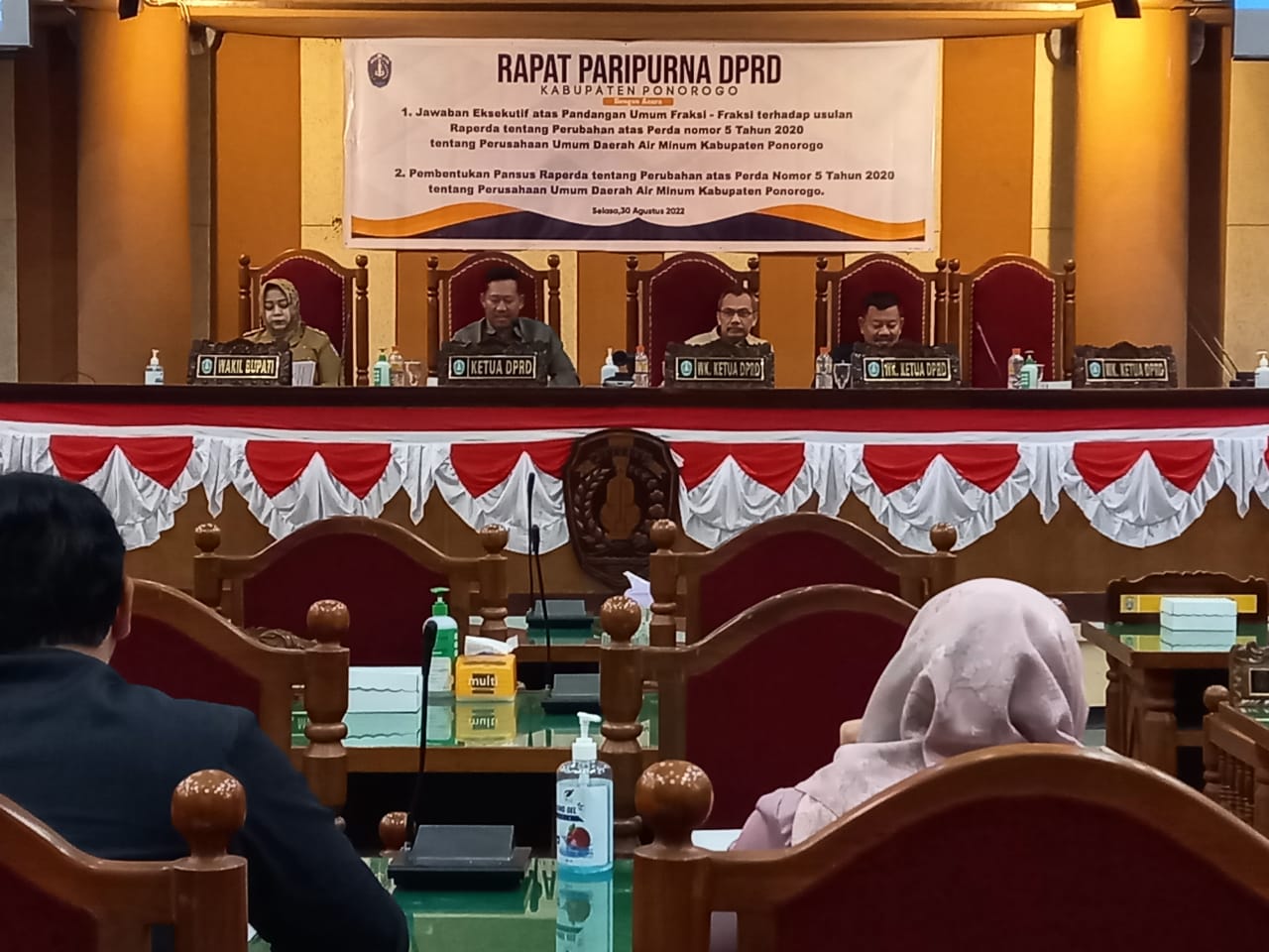 BeritaNasional.ID, Ponorogo – Dewan Perwakilan Rakyat Daerah (DPRD) Kabupaten Ponorogo menggelar rapat paripurna dengan agenda jawaban eksekutif terkait perubahan Perda nomor 5 tahun 2020 tentang Perusahaan Umum Daerah Air Minum (Perumda), di ruang rapat paripurna, Selasa (30/08/2022).