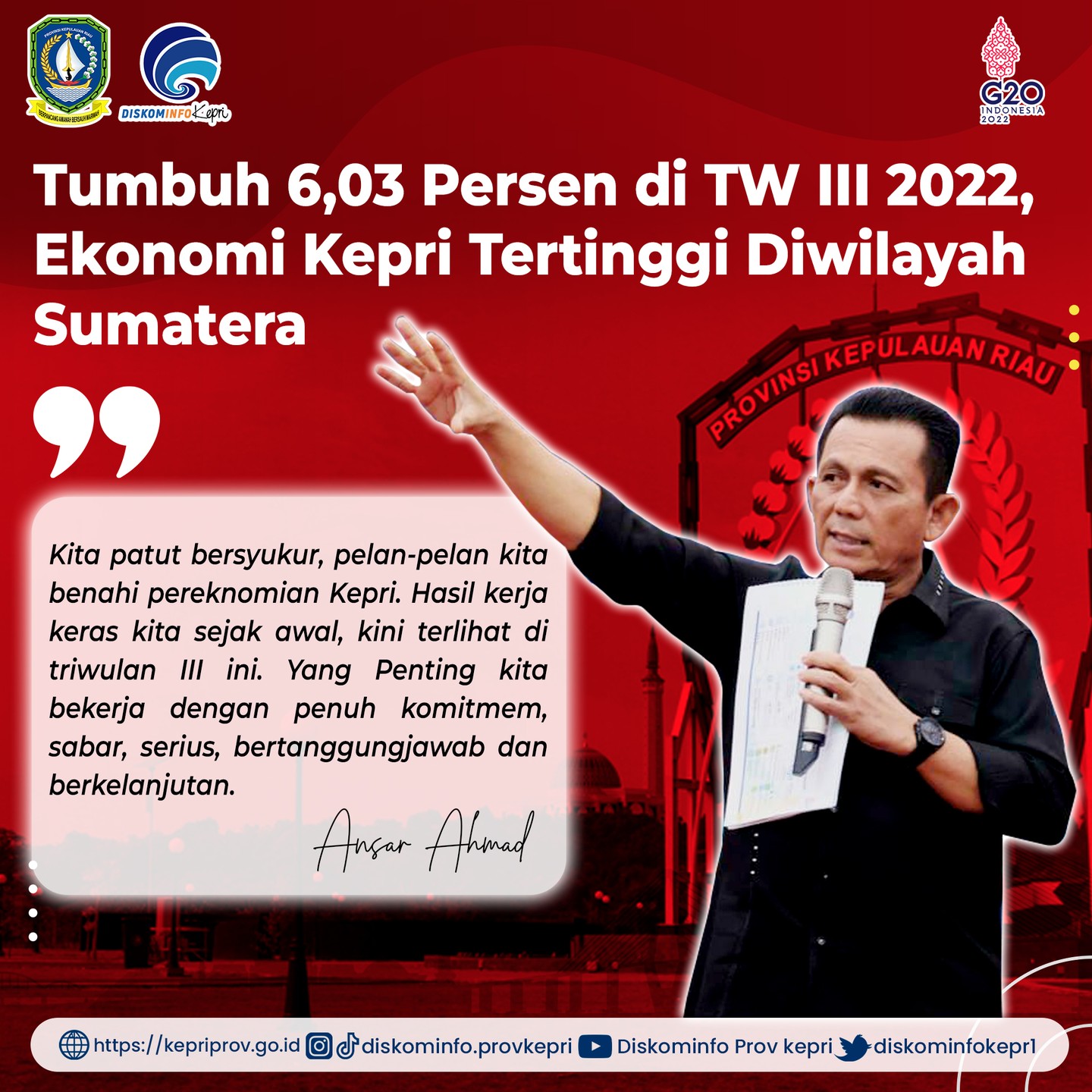 Gubernur Kepulauan Riau Ansar Ahmad, mengatakan percepatan pertumbuhan perekonomian Kepri ini sejalan dengan proyeksi. Didukung oleh meningkatnya mobilitas masyarakat seiring dengan semakin terkendalinya Covid-19 dan vaksinasi yang terus membaik, peningkatan kunjungan wisatawan dan aktivitas industri pengolahan.