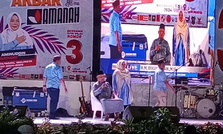 BeritaNasional.ID, PROBOLINGGO JATIM- Pasangan calon Wali Kota dan Wakil Wali Kota Probolinggo nomor urut 3, Dokter Aminudin dan Ina Buchori menggelar kampanye akbar di Gor Kedopok Mastrip, Minggu (17/11/2024) sekitar puku 13.30 WIB.