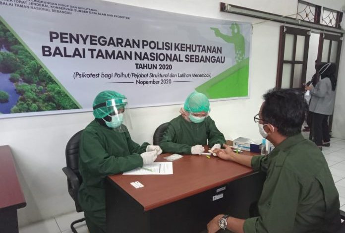 Kegiatan ini dipimpin oleh Penda Tk I Titik Nurcahyani, S.Kep. dan didampingi dua orang petugas untuk melaksanakan pemeriksaan Rapid Test di Kantor Balai Taman Nasional Sebangau.