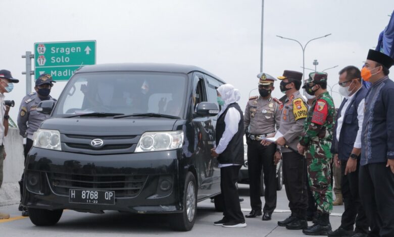 Beritanasional.ID, Ngawi – Gubernur Jawa Timur Khofifah Indar Parawansa bersama Pangdam V Brawijaya, Mayjen TNI Suharyanto, Kapolda Jawa Timur Irjen Pol. Dr Nico Afinta, melakukan tinjauan Posko Check Point penyekatan larangan mudik lebaran 2021 di Exit Tol Ngawi, Sabtu (8/5/21).