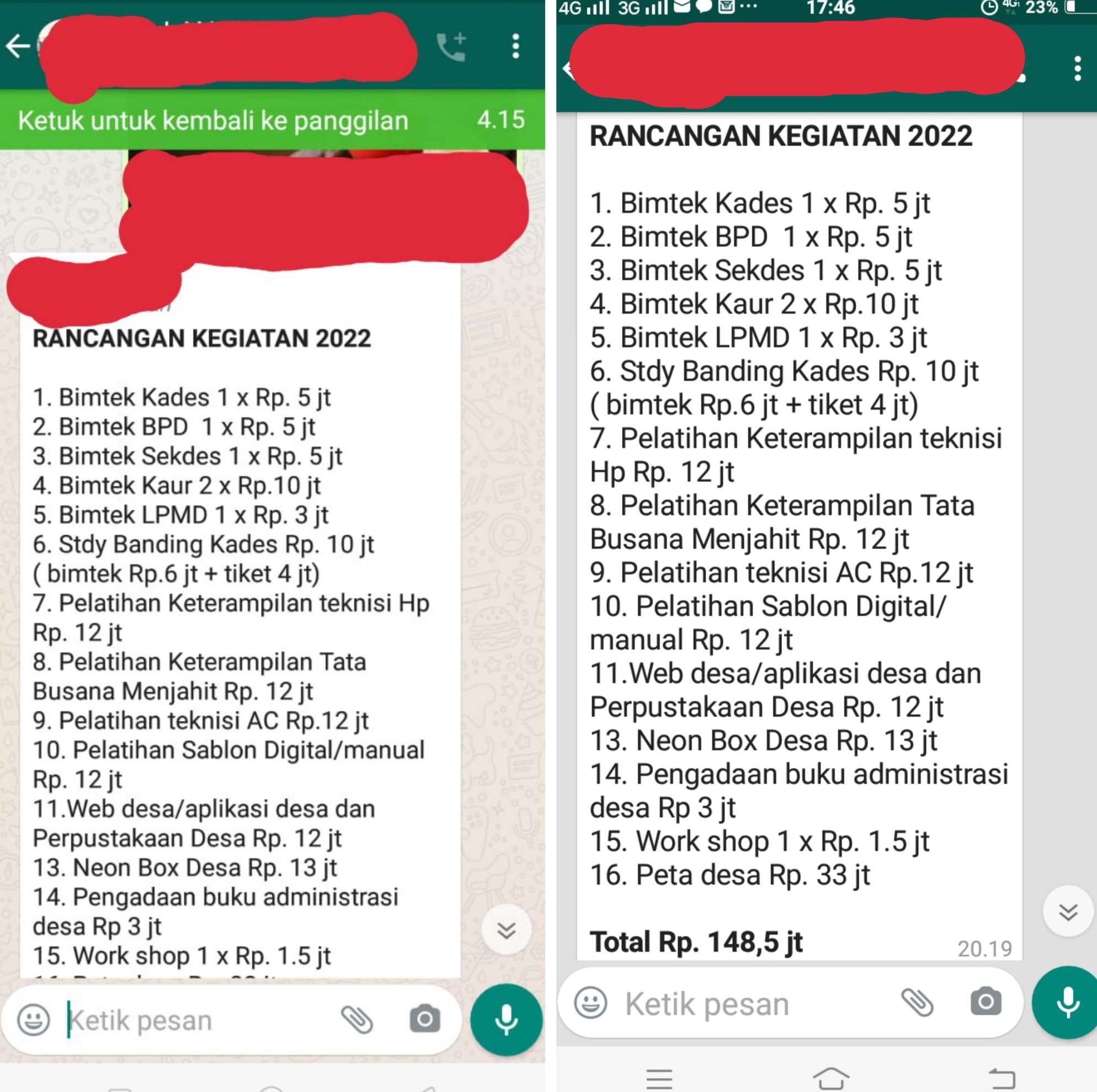 Pesanan dana gelondongan yang tersebar melalalui pesan singkat dari Aplikasi groub whatsApp groub maupun pribadi-pribadi itu sudah banyak disimpan aparat pemerintahan di desa sejak 2 bulan lalu.