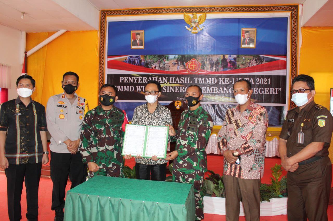 Penandatanganan dan penyerahan hasil program TMMD Ke 112 di Kab. Mamasa dilakukan oleh Dandim 1428/Mamasa Letkol Inf Stevi Palapa kepada Bupati Mamasa yang diwakili oleh Wakil Bupati Mamasa Marthinus Tiranda, S.IP.