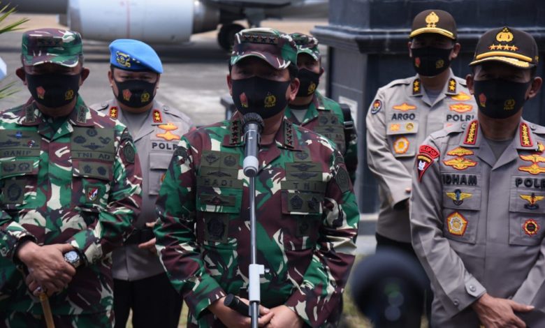 Sulbar–Panglima TNI Marsekal TNI Hadi Tjahyanto bersama Kapolri Jenderal Polisi Idham Azis , setibanya di Lanud Galaktika AURI Makasar, dalam rangka transit usai kunjungan kerja di Papua, mengggelar Jumpa pers dengan wartawan terkait kasus penyerangan Polsek Ciracas. Minggu (30/08/20)
