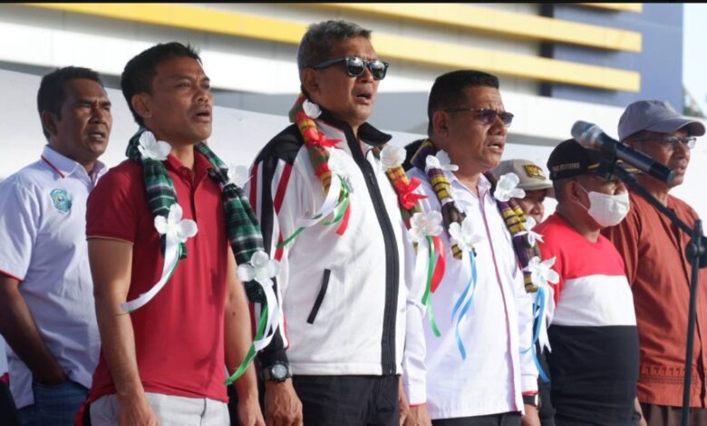 Pj Bupati disambut dengan pengalungan bunga, termasuk Ketua DPRD dan Ketua KONI Buteng, dilanjutkan dengan tarian tradisional khas Buton yang disaksikan ratusan masyarakat yang hadir memadati lapangan guna menyaksikan laga perdana antara klub dari Desa Lanto dan Desa Terapung.