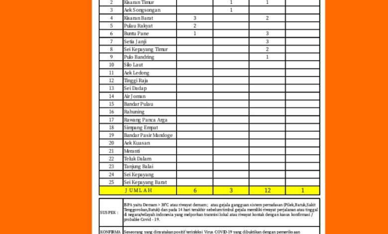 Untuk yang terkonfirmasi positif terpapar virus Corona sebanyak 3 orang masing – masing tersebar di Kecamatan Air Batu, Kisaran Timur, dan Aek Songsongan. Sedangkan penambahan warga yang sembuh sebanyak 12 orang tersebar di 6 Kecamatan yaitu Kecamatan Kisaran Timur 1 orang, Kisaran Barat 2 orang, Buntu Pane 3 orang, Setia Janji 3 orang, Sei Kepayang Timur 2 orang, dan Pulo Bandring 1 orang.