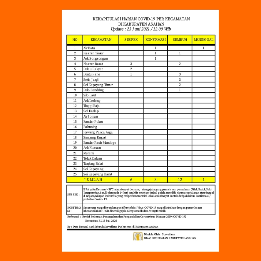 Dikatakan Tanjung, berdasarkan rekapitulasi harian Covid – 19 Kabupaten Asahan per Kecamatan hari ini tanggal 23 Juni 2021 penambahan kasus suspek baru sebanyak 6 orang dan tersebar di 3 Kecamatan yakni Kisaran Barat 3 orang, Pulau Rakyat 2 orang, dan Buntu Pane 1 orang.