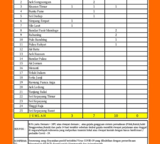 Kemudian untuk kasus terkonfirmasi positif yang bertambah sebanyak 7 orang tersebar di Kecamatan Kisaran Barat 2 orang, Aek Songsongan 2 orang, Kisaran Timur 1 orang, Sei Dadap 1 orang, dan Buntu Pane 1 orang. Sedangkan untuk yang sembuh bertambah sebanyak 10 orang dan tersebar di Kecamatan Kisaran Barat 3 orang, Kisaran Timur 1 orang, Bandar Pasir Mandoge 2 orang, Rahuning 2 orang, Pulo Bandring 1 orang, dan Pulau Rakyat 1 orang.