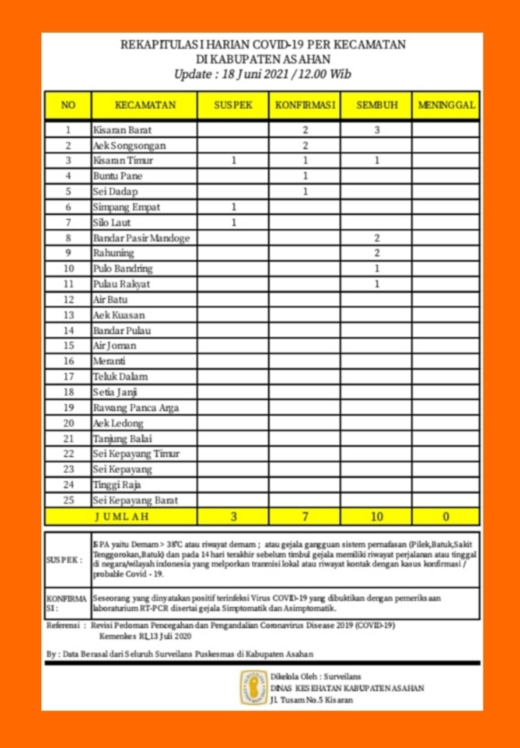 Dikatakannya, berdasarkan data hasil rekapitulasi harian Covid – 19 Kabupaten Asahan per Kecamatan pada hari ini tanggal 18 Juni 2021 diketahui bahwa penambahan kasus baru suspek sebanyak 3 orang masing – masing tersebar di Kecamatan Kisaran Timur, Simpang Empat, dan Silau Laut.