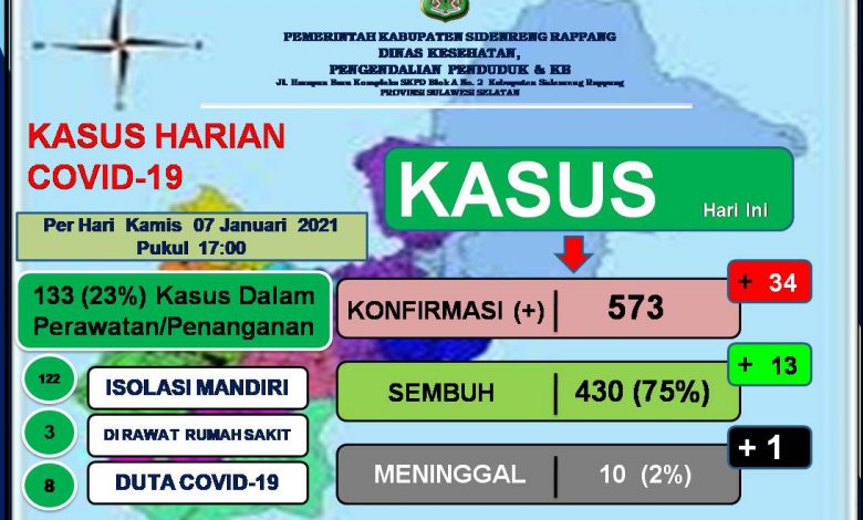 Hingga saat ini, sejak Pandemi angka perkembangan kasus terkonfirmasi positif covid-19 Sidrap mencapai 573 kasus, sembuh sebanyak 430 kasus dan 10 Meninggal.