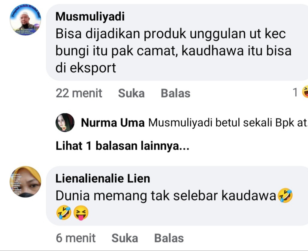 Dalam komentar Akun facebook Musmulyadi,Bisa dijadikan produk unggulan ut kec bungi itu pak camat, kaudhawa itu bisa di eksport.