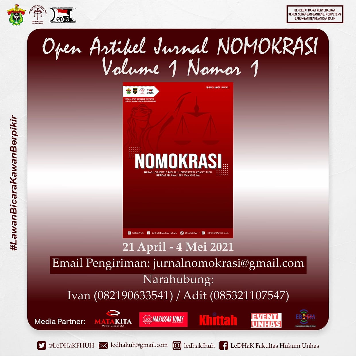 Wadahi Mahasiswa Hukum Se-Indonesia, LeDHaK FH-UH Open Artikel Jurnal Nomokrasi