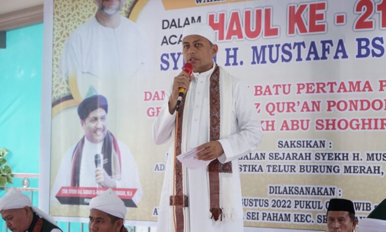 BeritaNasional.Id – Asahan, Sumatera Utara – Wakil Gubernur Sumatera Utara didampingi Sekretaris Daerah Kabupaten Asahan Drs. John Hardi Nasution MSi menghadiri Haul ke – 21 Allahuyarham Syekh H. Mustafa BS. Rokan di halaman Pondok Pesantern Syekh Abu Shoghir Dusun III Desa Sei Paham Kecamatan Sei Kepayang, Jum’at (26/08/2022).