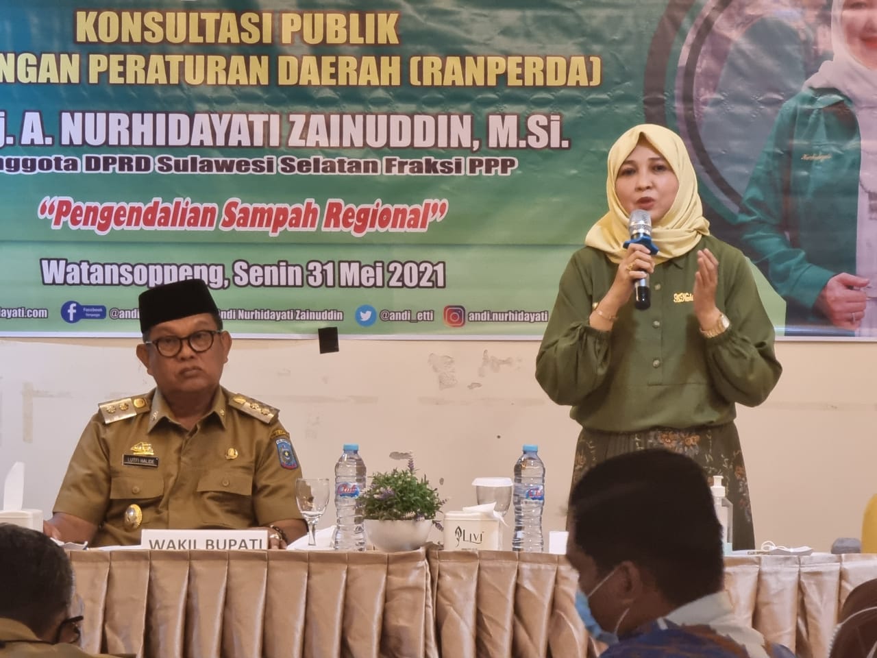 BeritaNasional.ID, Soppeng – Anggota DPRD Sulsel, Andi Nurhidayati Zainuddin menggelar kegiatan Konsultasi Publik Rancangan Peratutan Daerah (Ranperda) Tentang Pengendalian Sampah Regional di Hotel Grand Aisha Watansoppeng, Senin (31/5/2021).