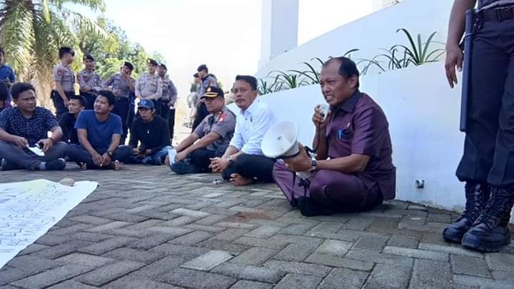 Para demonstran ditemui langsung oleh wakil ketua DPRD Mamuju Andi Dodi dan ketua komisi 1 H.Sugianto, mereka diajak berdialog dengan cara duduk bersila diplataran gedung DPRD Mamuju.